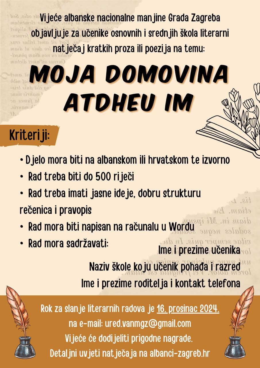 Vijeće albanske nacionalne manjine Grada Zagreba objavljuje za učenike osnovnih i srednjih škola literarni natječaj s kratkih proza i poezija na temu: Moja domovina/Atdheu im